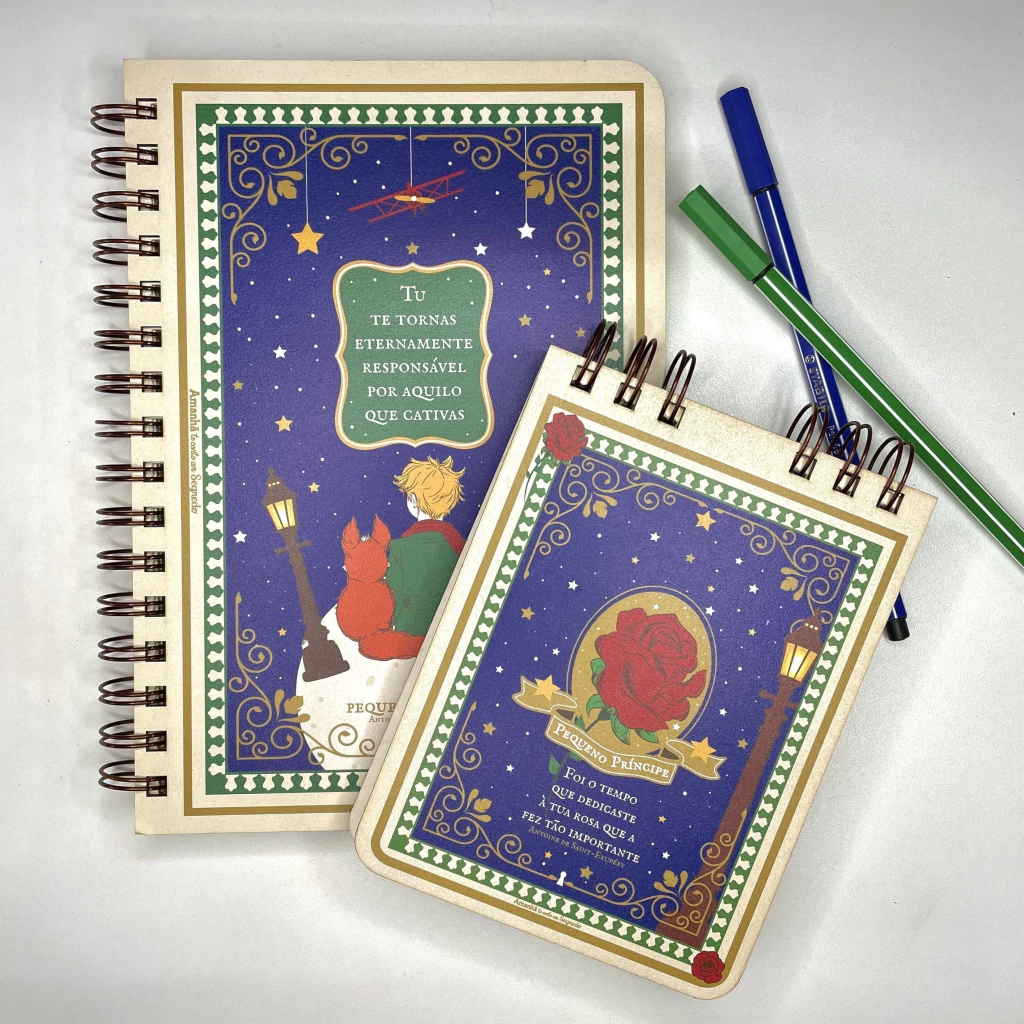 Caderno especial com capa em madeira. Estampa exclusiva.