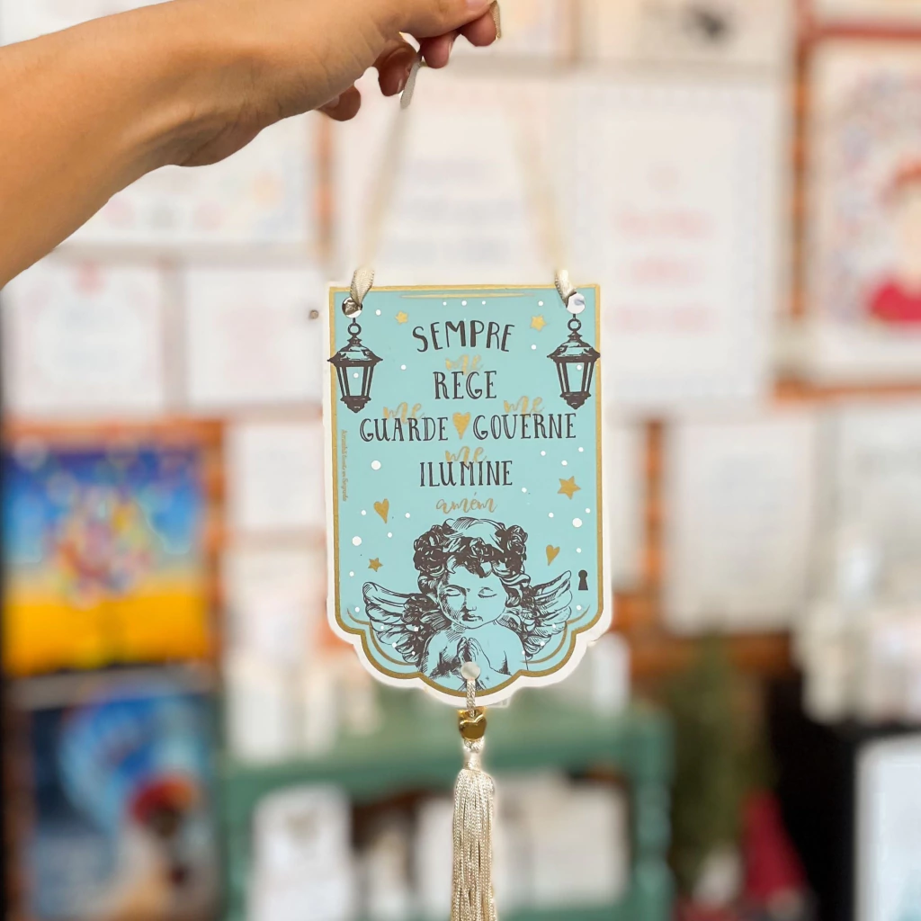 Flâmula decorativa para portas e paredes. Técnica de pintura provençal. Material: MDF e fita de cetim.